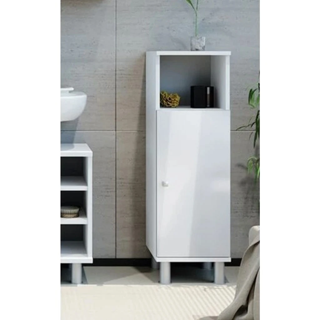 وحدة تخزين حمام باللون الأبيض، بتصميم أنيق ومتين مقاوم للمياه. توفر مساحة تخزين واسعة تجعلها إضافة مثالية لأي حمام.